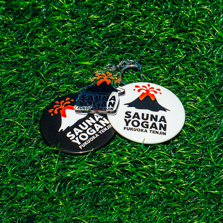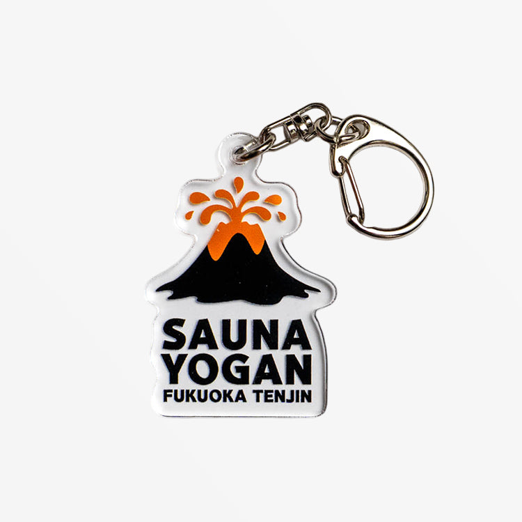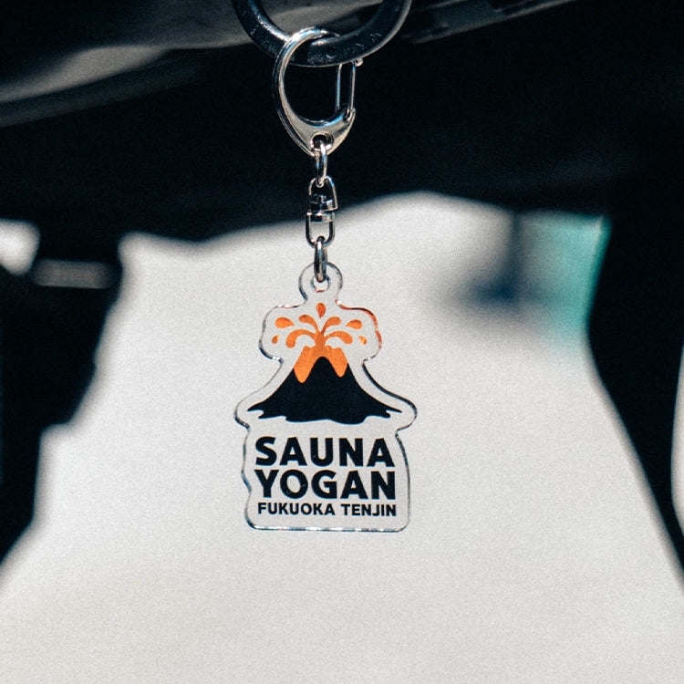 SAUNA YOGANのロゴアクリルキーホルダー。施設のイメージカラーであるオレンジとブラックのベージックなデザインになっています。サイズ感もほどよく弊社イチオシのキーホルダー。