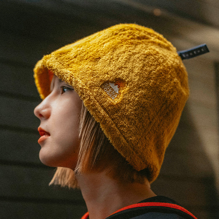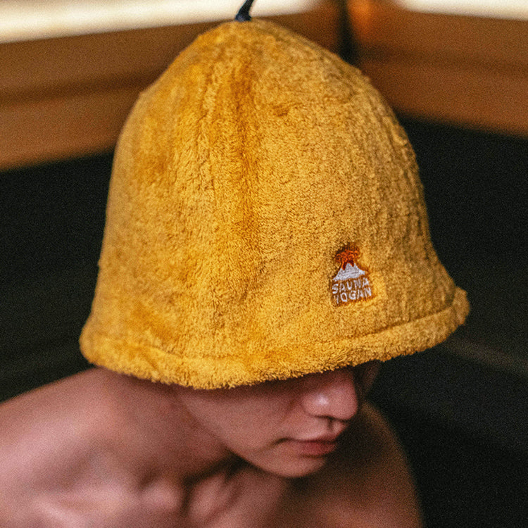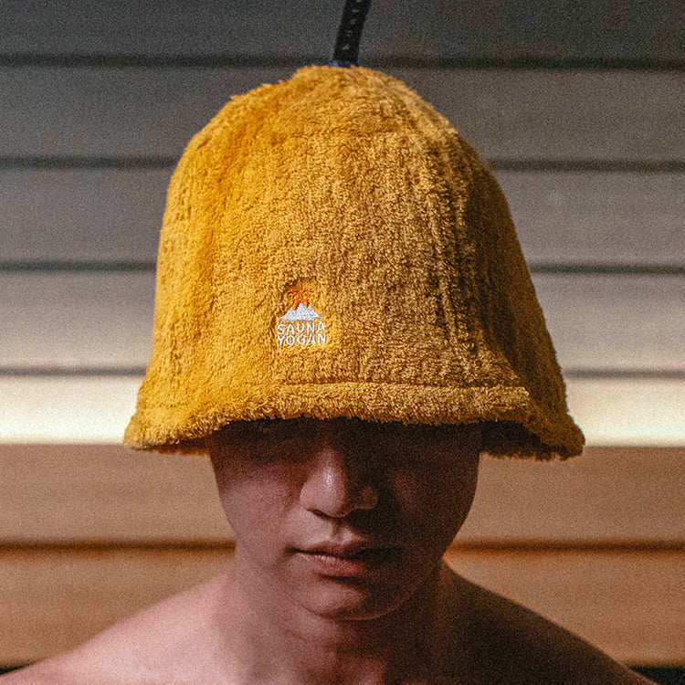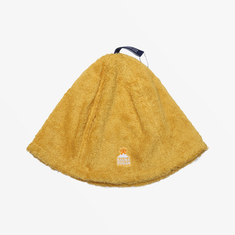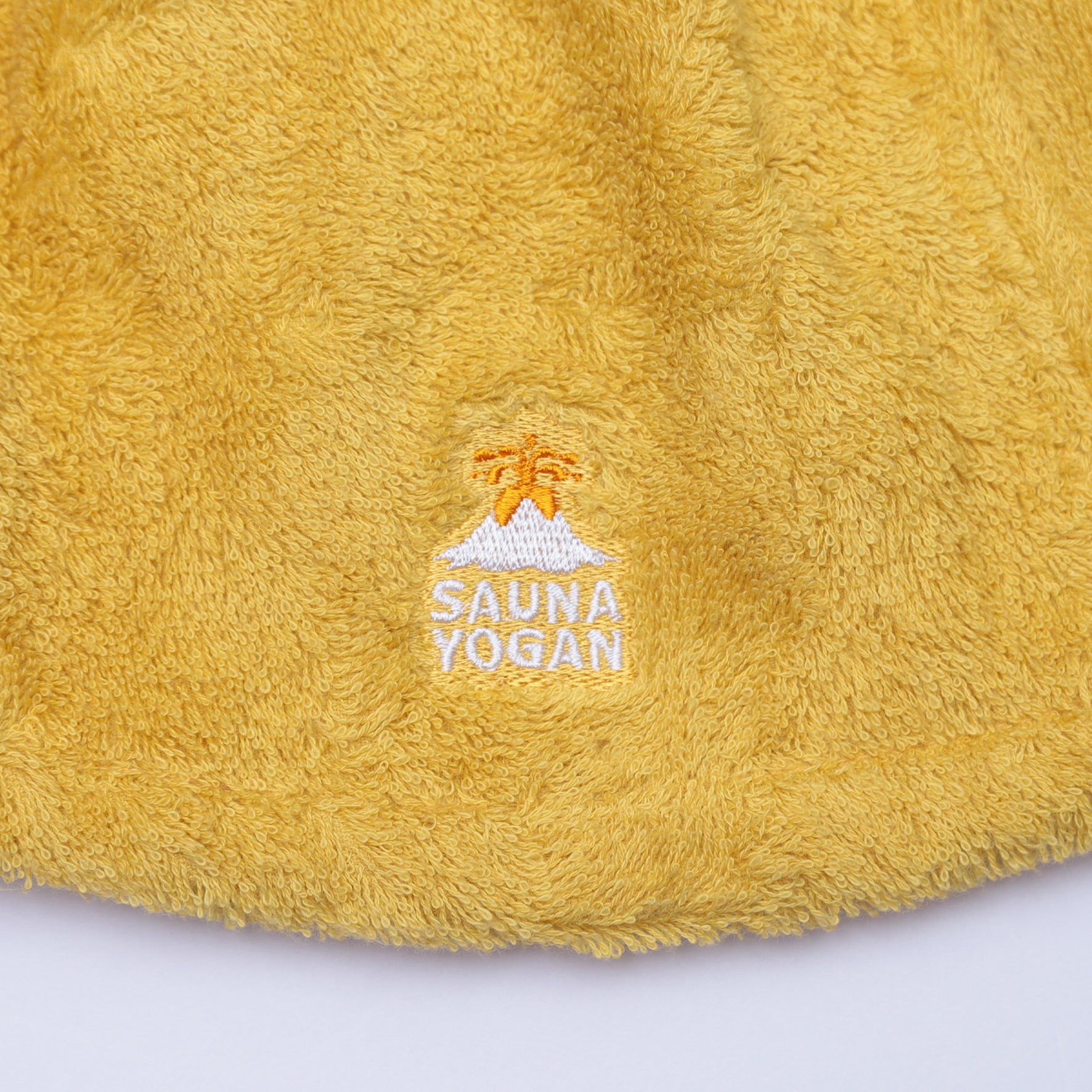 SAUNA YOGANの刺繍ロゴと側面にポケットをあしらったサウナハット。