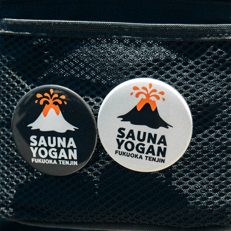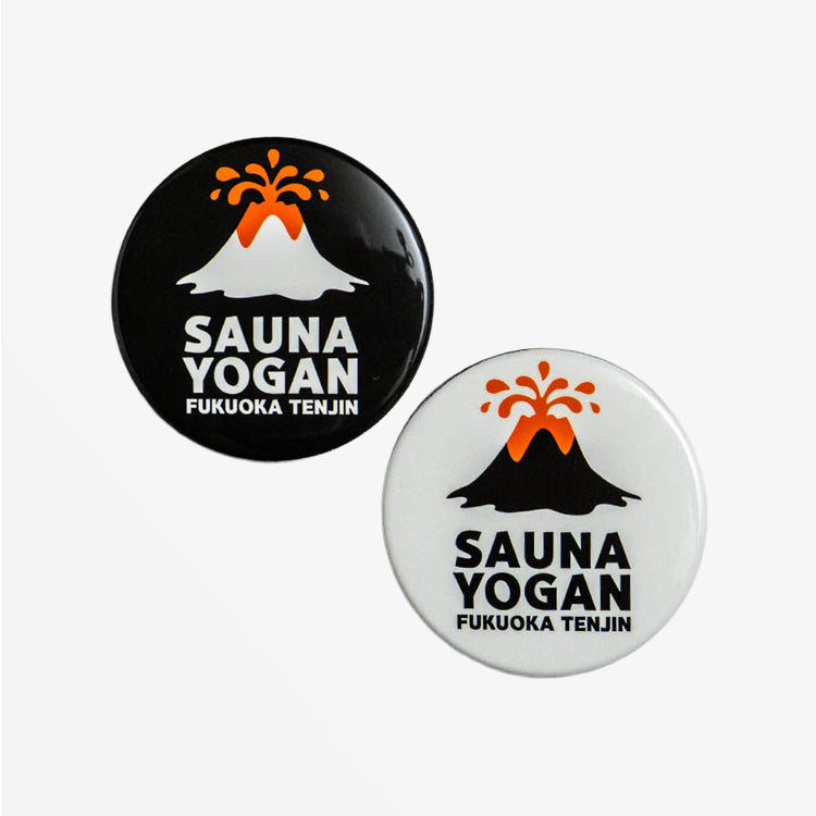 SAUNA YOGANのロゴ缶バッジ。カラーはシンプルなブラックとホワイトの2色です。大きめサイズで目を引くデザイン。全国の温泉やサウナ施設の缶バッジをお集めの方にオススメです。