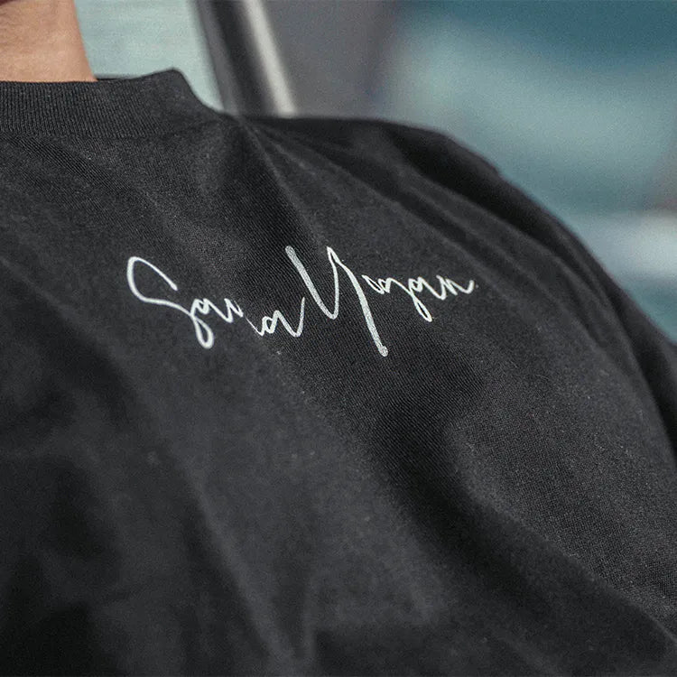 胸元に「SaunaYogan」と筆記体でプリントされたオリジナル長袖Tシャツ。